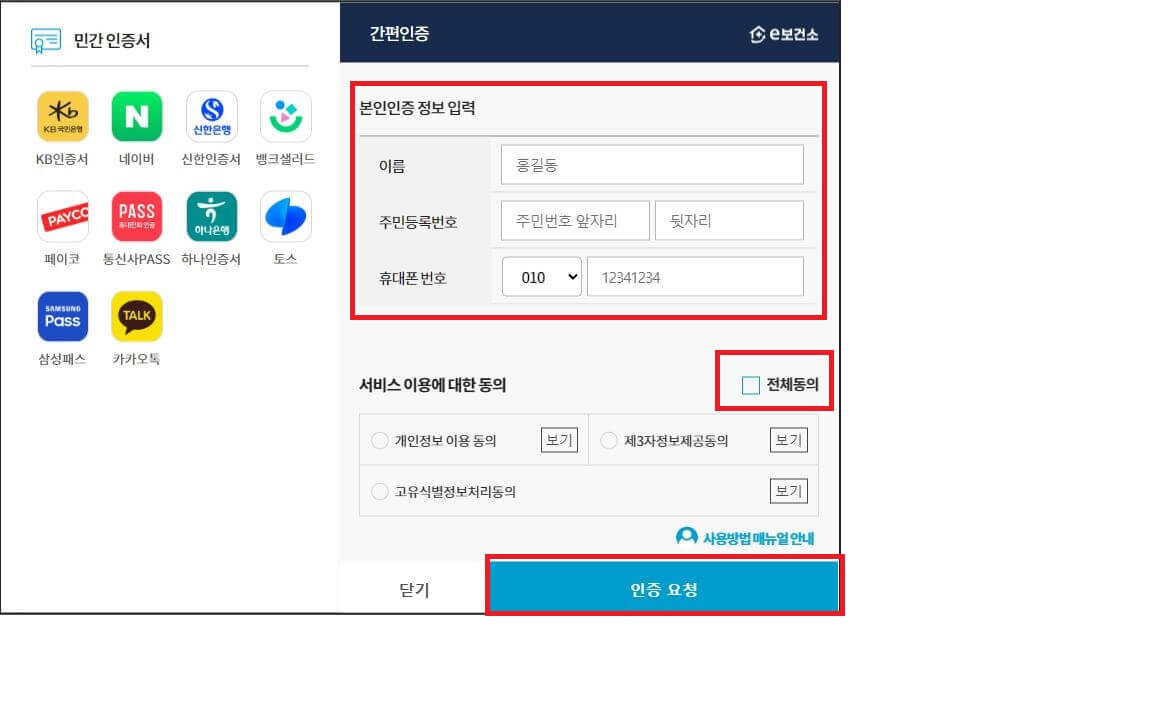 e보건소 클릭> 증명 문서 발급 > 건강진단결과서(구보건증) > 동의, 확인 체크 > 본인인증