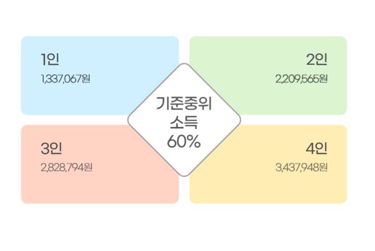 청년월세 지원조건 중 기준 중위소득 60% 이하, 원가구 중위소득 100% 이하의 조건이 있는데, 그 기준을 알아보겠습니다.