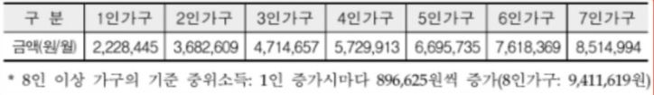 원가구는 청년독립가구 + 1촌이내 직계혈족(부,모) 100%의 경우 3인 가구 4,714,657원, 4인가구 5,729,913원입니다.